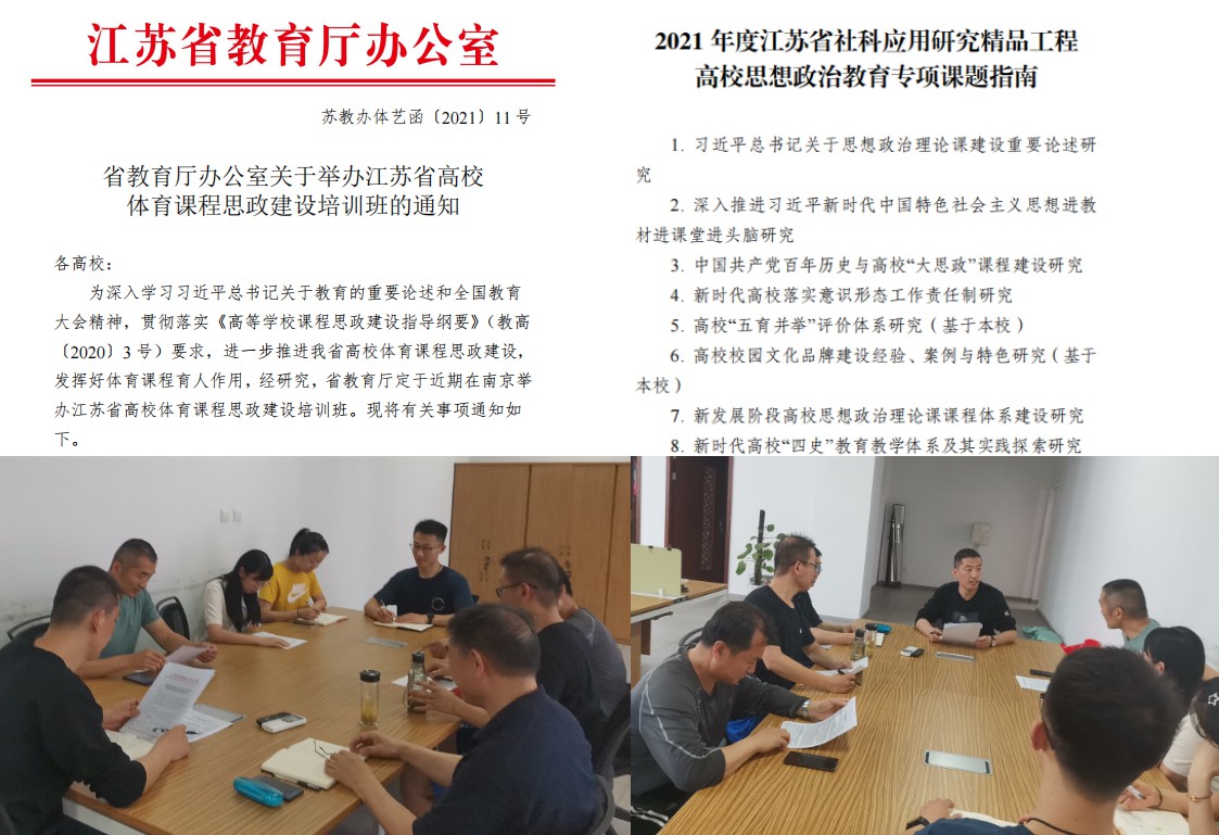 2021年5月25日下午,体育教研室全体教师对江苏省高校体育课程思政建设培训内容进行了学习与交流。